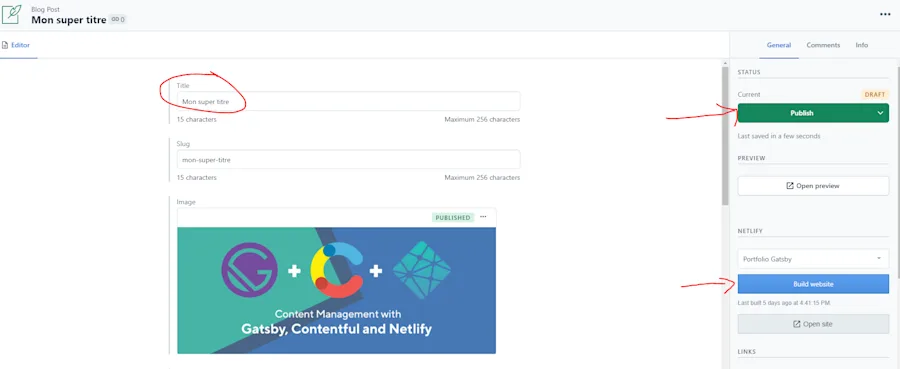 Note: Comme pour site en JAMStack, il faut prévoir un temps de "construction du site" à chaque mise à jour (1 minute à quelques minutes selon la taille de votre site). Mais Gatsby s'améliore constamment sur ses temps de "Build".